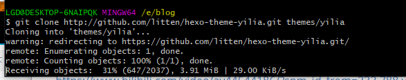 git clone http://github.com/litten/hexo-theme-yilia.git themes/yilia (注意当前路径在blog下)